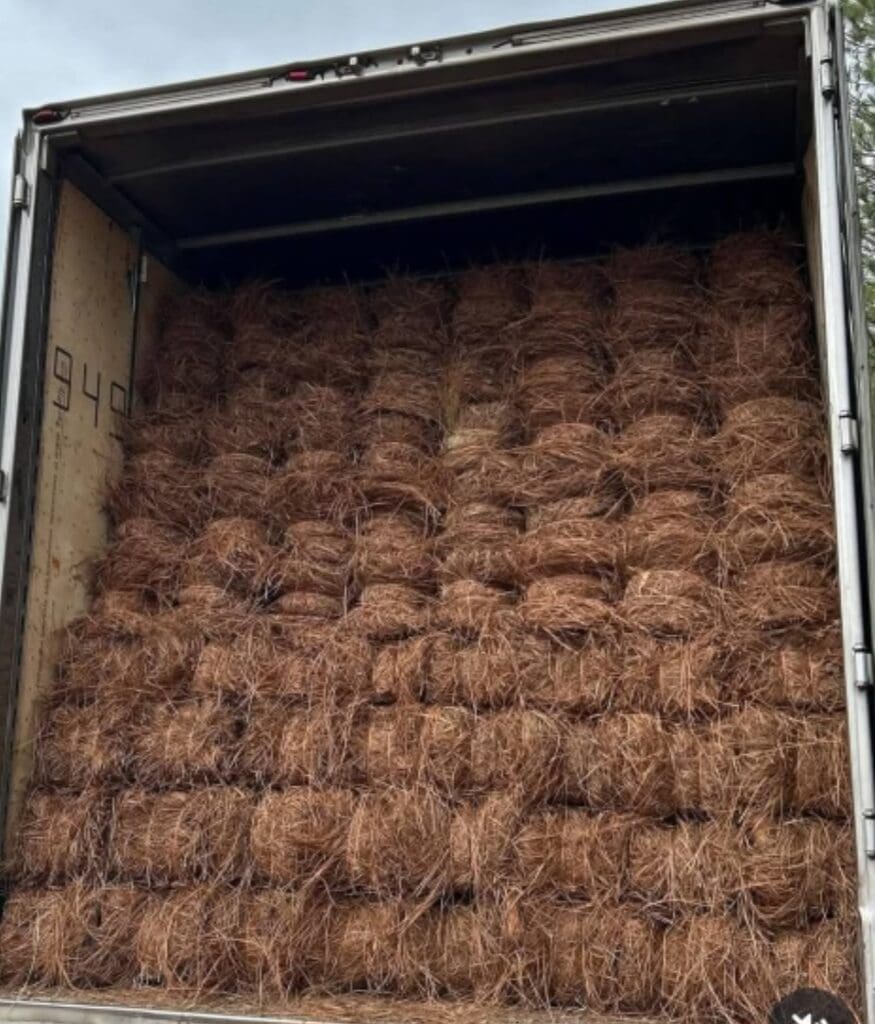 We carry pinestraw rolls to save you money and time. They are not as compacted as bales which makes them 10x easier to spread out. One roll is equivalent to around 2.25-2.5 bales.